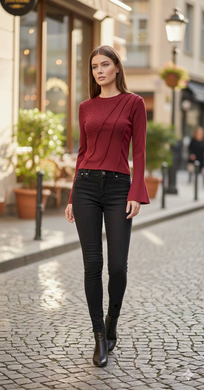 Bluzun en dikkat çekici detayları; dışa dönük olarak uygulanan ters dikiş hatları ile sağlanan modern ve dinamik görünüm, ve zarif ışıltı katan taş detaylarıdır. Bluzun enerjisini yükselten İspanyol Kol kesimi, hareketli bir silüet oluşturarak kombinlerinize farklı bir hava katar.